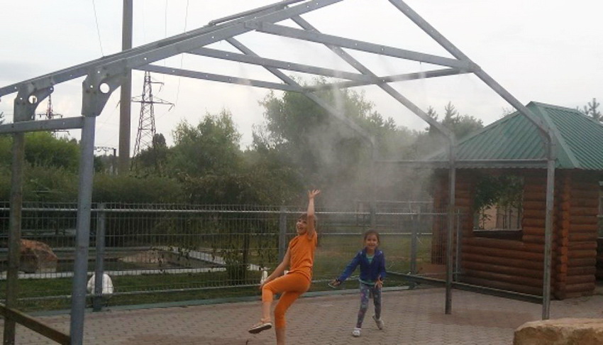 «Ми ставимо на таймер і система працює самостійно, – розповідає директор зоопарку. – Температура є небезпечною навіть для дітей. Для того, аби вона встигала прогріватися, форсунки підняли якомога вище. Мокрою людина не буде. Там тільки туман, як у теплиці».