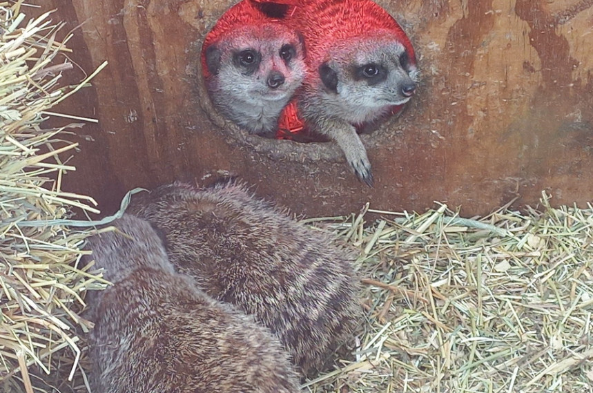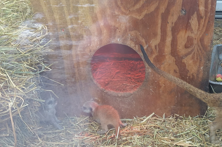 «Лігво породілля влаштувала цього разу не у будиночку, а під тюком сіна. Тут вона проводить зі своїми малюками переважну частину часу.Іноді сурікатиха вибирається зі своєї схованки, але дітей від себе ні на мить не відпускає. Малюки ще доволі слабкі. Втім, дуже допитливі і весь час намагаються вирватися з-під маминої опіки. Доки дорослі зайняті доглядом за новонародженими та дбають про безпеку родини, молодняк розважається. Один за одним молоді сурікати видираються на тюк сіна, а потім зістрибують вниз, змагаються на кмітливість та граються один з одним у теплому будиночку. Молоді тварини небайдужі до новонароджених. Час від часу вони намагаються притиснутись до матері та малюків, а потім знов біжать до компанії», - розповідають у прес-службі зоопарку.