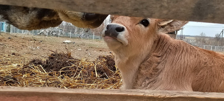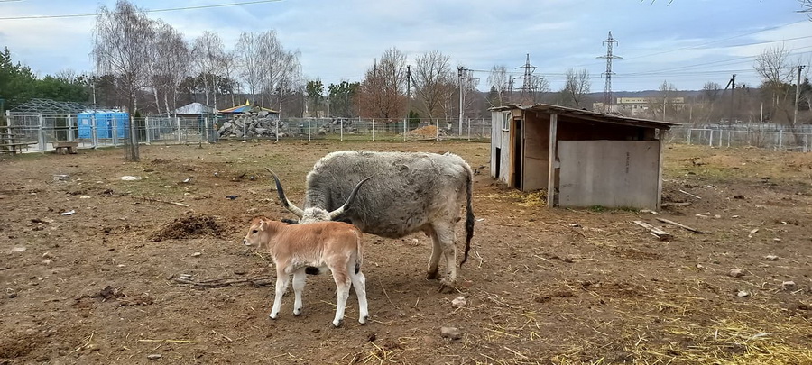 У вольєрі корів угорських мама і тато бавлять малюка. Мама дбайливо облизує дитинча. Його народження вона чекала дев’ять місяців. Шість місяців телятко перебуватиме на грудному вигодовуванні. Про безпеку родини дбає татусь. Він постійно поряд та уважно стежить за малюком.