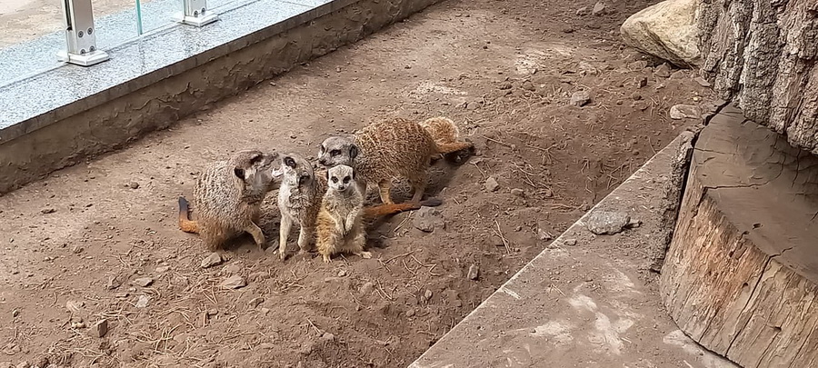Сурікатики, яким лише півтора місяці, навчились ставати на задні лапки. Тепер вони, як і дорослі, вміють стояти на варті.