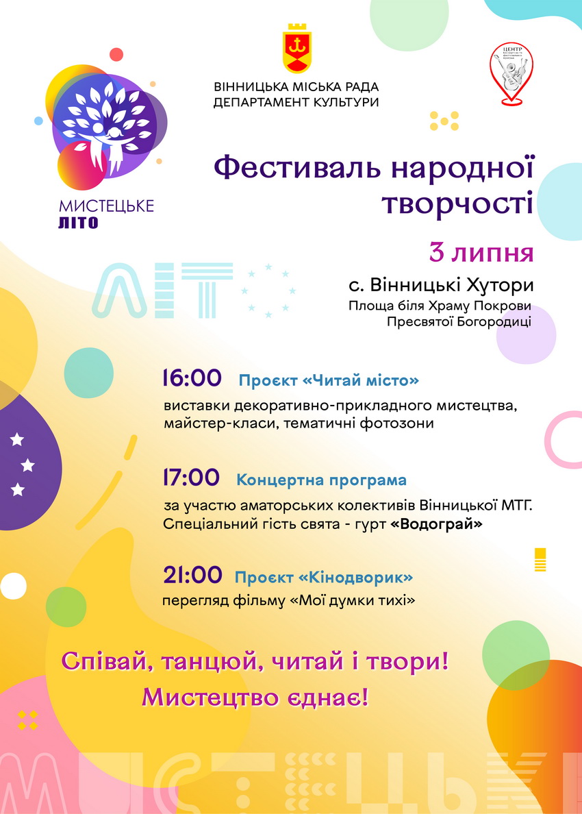 У Вінниці 3 липня, розпочнеться проєкт «Мистецьке літо». Він проходитиме у Вінниці та на приєднаних територіях - у селах Вінницькі Хутори, Щітки, Малі Крушлинці та Десна. Розпочнеться цикл заходів у с. Вінницькі Хутори, де відбудеться Фестиваль народної творчості.