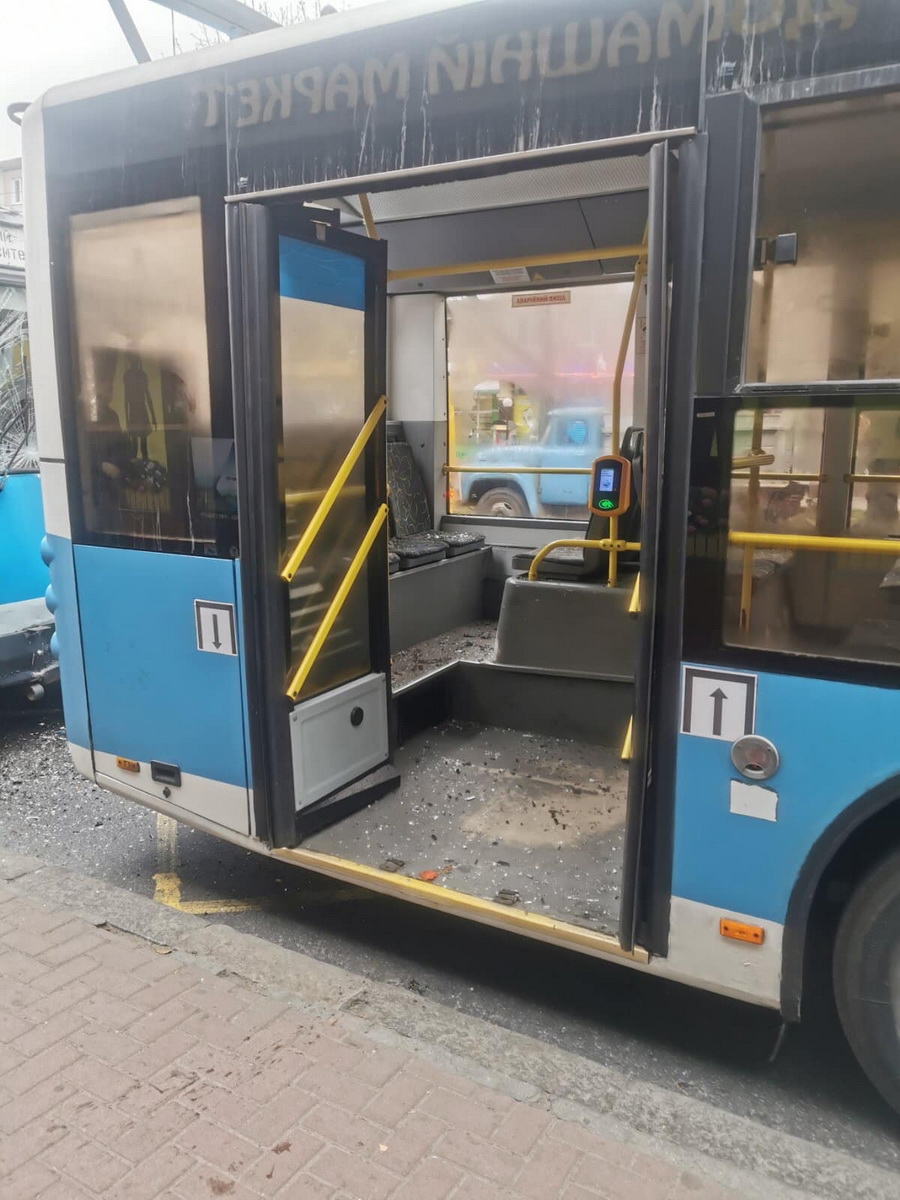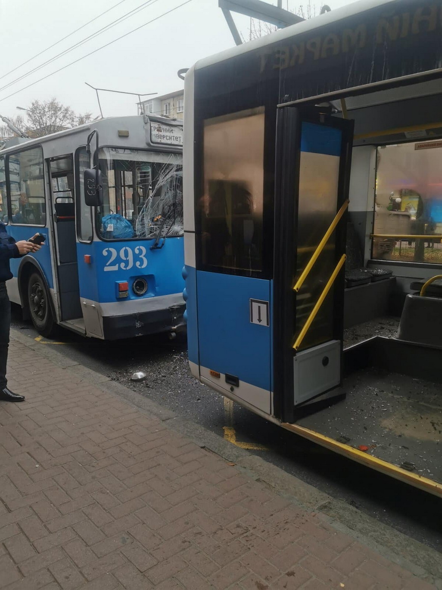 Аварія сталася на зупинці громадського транспорту біля лікарні №2. Як видно на фото, один тролейбус в’їхав у задню частину іншому. Від удару, в тролейбуса, який стояв попереду – скло впало у салон, а у того, що попереду – великі тріщини на лобовому склі.