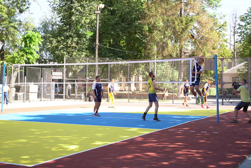 В рамках реконструкції спочатку влаштували бетонну основу, потім постелили поліуретанове покриття зі спеціальними амортизаційними властивостями. Зробили розмітку для волейбольного майданчика.