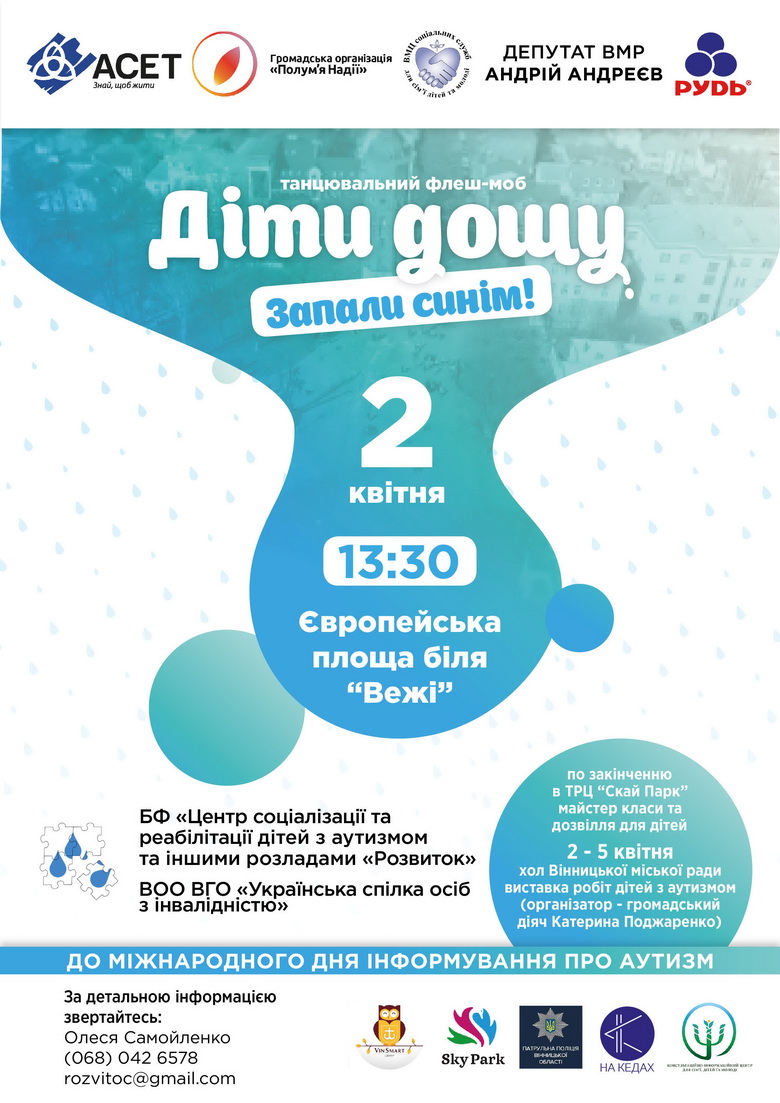 2 квітня, в Міжнародний день поширення інформації про аутизм, у Вінниці біля Вежі влаштують танцювальний флешмоб «Діти дощу. Запали синім». Захід відбудеться о 13:30 годині.