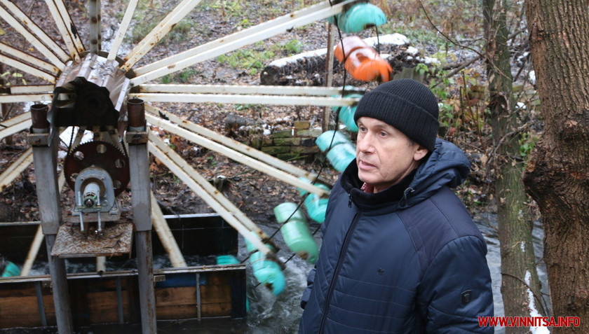 «Течія води захоплює ковші і вони пірнають у воду яка біжить, маса води заставляє обертатися колесо, а вже з осі колеса цього я знімаю свої ньютони обертового моменту і за допомогою зірок та ланцюга передаю на редуктор. На кіловат електроенергії потрібно 50 метрів кубічних води за хвилину, яка падає з висоти чотирьох метрів. Тому кіловат звідси не візьмеш – а от 150 - 300 Ват — можливо. Було б чудово, якби хтось з спонсорів захотів би мені допомогти, щоб ще придбати генератор та перетворювач напруги із 12 на 220В. Я маю лише позичений тракторний генератор, який, може запрацювати від 500 обертів за хвилину. А їх ще потрібно добитися. Якщо це спрацює енергія потрапить на акумулятор, який буде встановлений в моєму гаражі, а звідтіля відразу в наше бомбосховище у будинку, яке є одночасно і пунктом обігріву. Електроенергію від цієї ГЕС можна буде накопичувати в автомобільних чи інших акумуляторах, та використати у критичний момент для освітлення та заряджання телефонів і інших побутових пристроїв», - зазначає вінничанин.