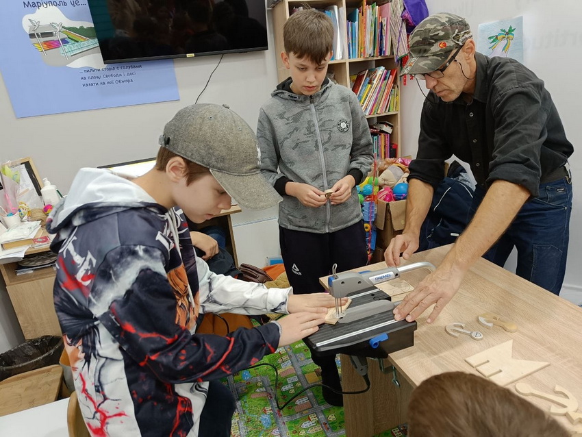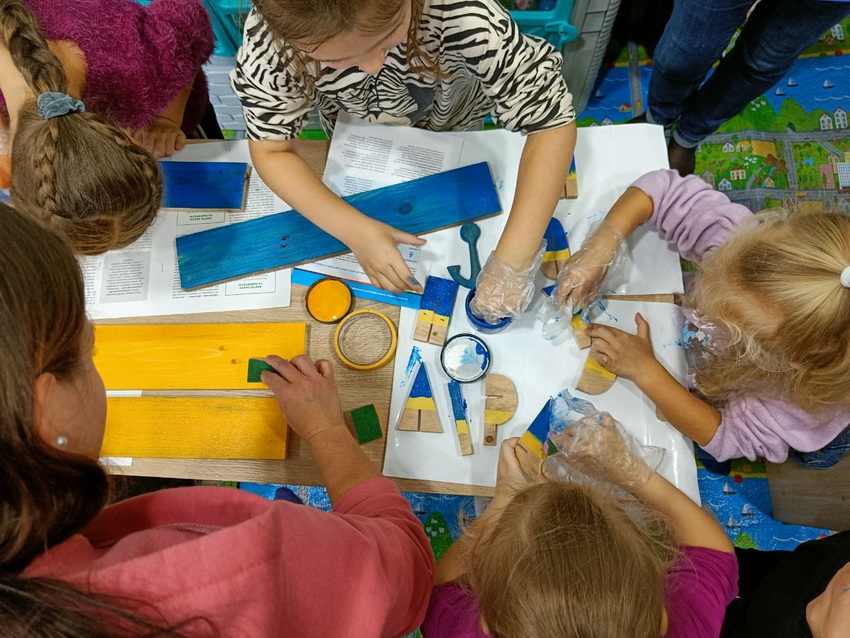 Старші діти випилювали якорі, а молодші разом з мамами розфарбовували у кольори країни дерев'яні літери назви рідного міста. Також всі учасники майстеркласу вкотре загадали бажання аби повернутися до українського Маріуполя.