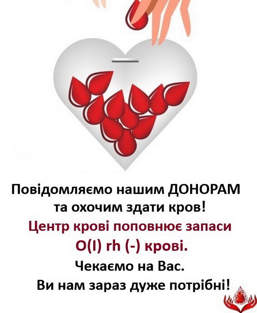 «Повідомляємо нашим донорам та охочим здати кров! Центр крові поповнює запаси крові з негативним резус-фактором – О (I) rh (-). Чекаємо на вас, ви нам зараз дуже потрібні!», - йдеться в повідомленні.