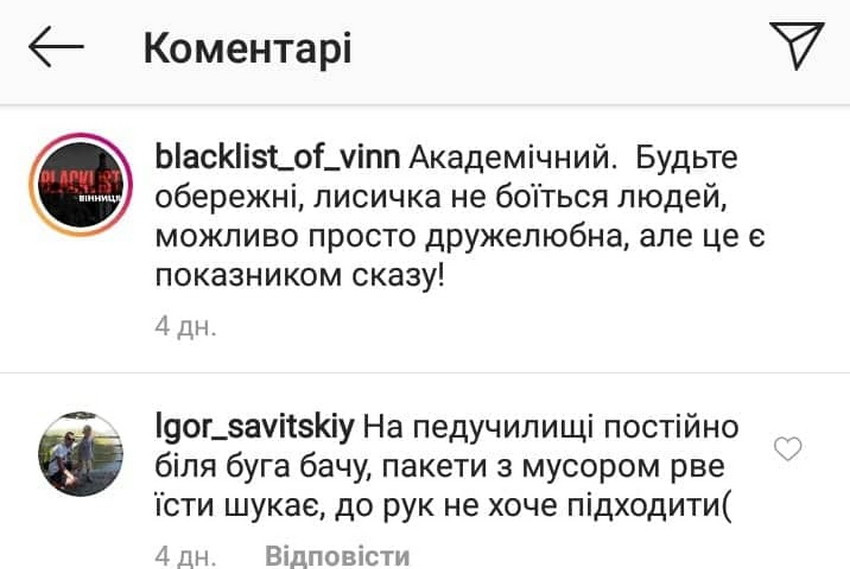 У вінницькому мікрорайоні Академічний місцеві жителі час від часу помічають молоду лисицю, яка з’являється неподалік їх помешкань. Тварина не агресивна, просить у людей їжу. Деяким дозволяє себе погладити. Також риється у смітниках. Про це вінничани пишуть у соціальних мережах.