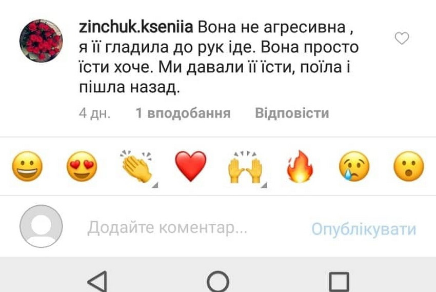 «Вона не агресивна, я її гладила. До рук не йде. Вона просто хоче їсти. Ми давали їй поїсти. Поїла, і пішла назад», - розповіла Ксенія Зінчук.