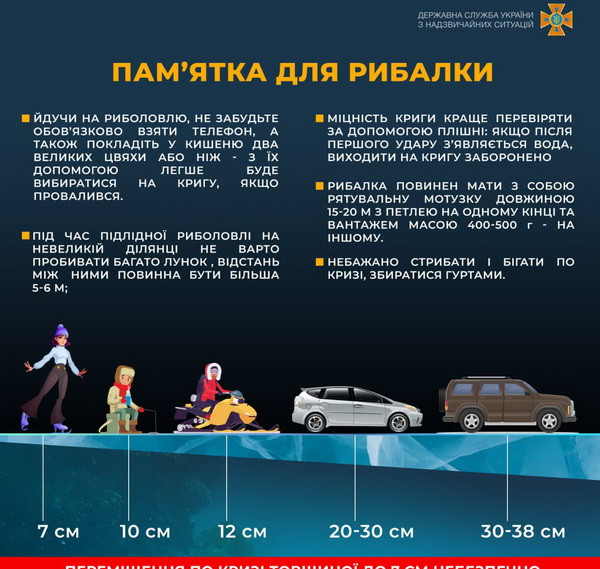 «Допоки українці сприйматимуть ледь замерзлі водойми як ковзанку, а не потенційне джерело небезпеки - рятувальники знову й знову шукатимуть і вилучатимуть потонулих людей.Так, фахівці Служби порятунку вже «збирають врожай» наслідків байдужого ставлення до безпеки громадян, які вирішили перевірити на міцність найближчі ставки та річки за першої ж нагоди. Рятувальники застерігають, різкі морози не гарантують безпечного відпочинку на кризі! Те, що водойма виглядає замерзлою - не означає, що товщина льоду достатня для того, щоб витримати хоча б дитину», - повідомляють надзвичайники.
