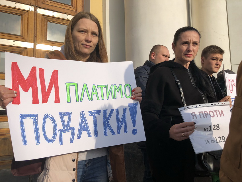 28 жовтня вранці біля будівлі Вінницької ОДА – акція протесту. Близько двадцяти людей протестують проти прийняття законопроектів № 128 та № 129. Фізичні особи підприємці переконують, що зазначені закони знищують малий бізнес. Варто відмітити, що на акцію вийшли ФОП-и, які на 2 та 3 групі оподаткування. Є ювеліри, власники крамничок і навіть працівники однієї з найбільших логістичних компаній в країні, які оформлені ФОП-ами.