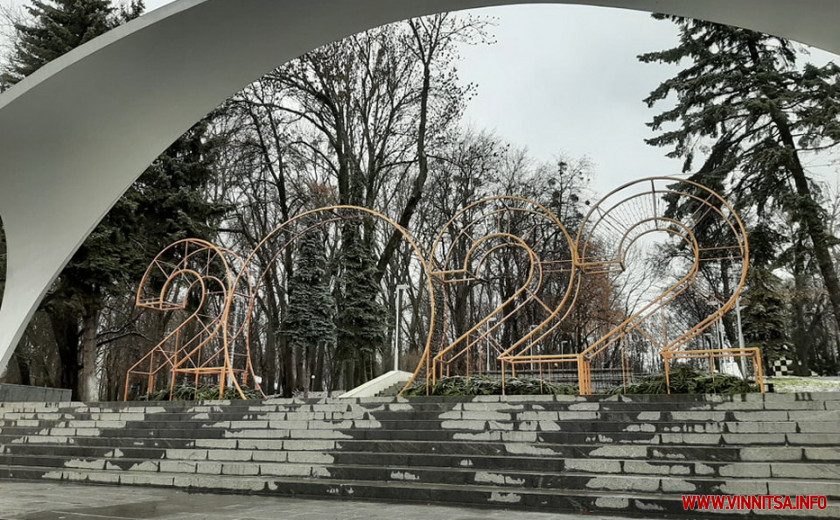 З 18 грудня біля головного входу до Центрального парку імені Миколи Леонтовича у Вінниці, встановили святкову новорічну ілюмінацію. Велетенські цифри – 2022 розмістили на сходах під аркою. У вечірню пору інсталяція буде світитися.