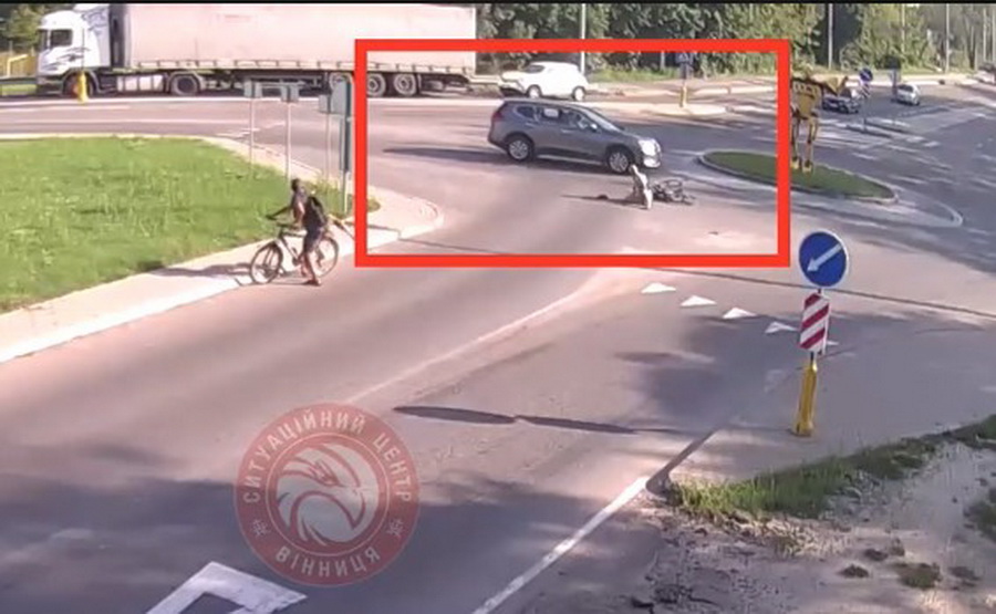 Автопригоду сьогодні вранці у Вінниці зафільмували камери Ситуаційного центру. Громадянин, керуючи автомобілем Nissan, не надав перевагу у русі велосипедисту, який рухався головною дорогою на круговому перехресті.