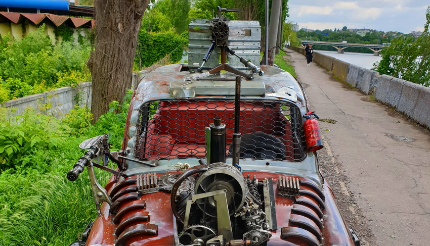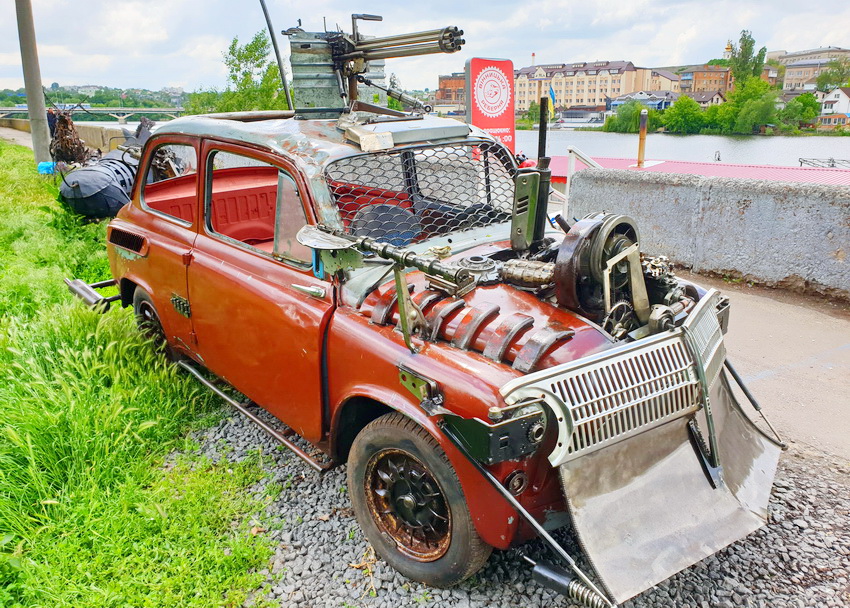 На вінницькій набережній з’явився постапокаліптичний автомобіль. Біля реберні розмістили червоного «Запорожця», стилізованого під фільм «Шалений Макс». Всі охочі можуть сфотографуватися - поруч або всередині.незвичайного кару.