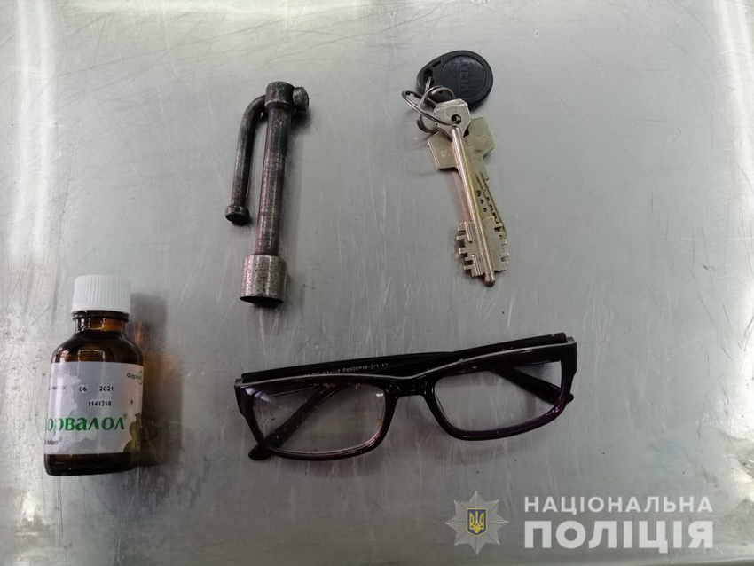 При собі мав окуляри в пластмасовій оправі фіолетового кольору, краплі «Корвалол» 25 мл, ключі з брелком від домофону «VIZIT», ключ від штаби.