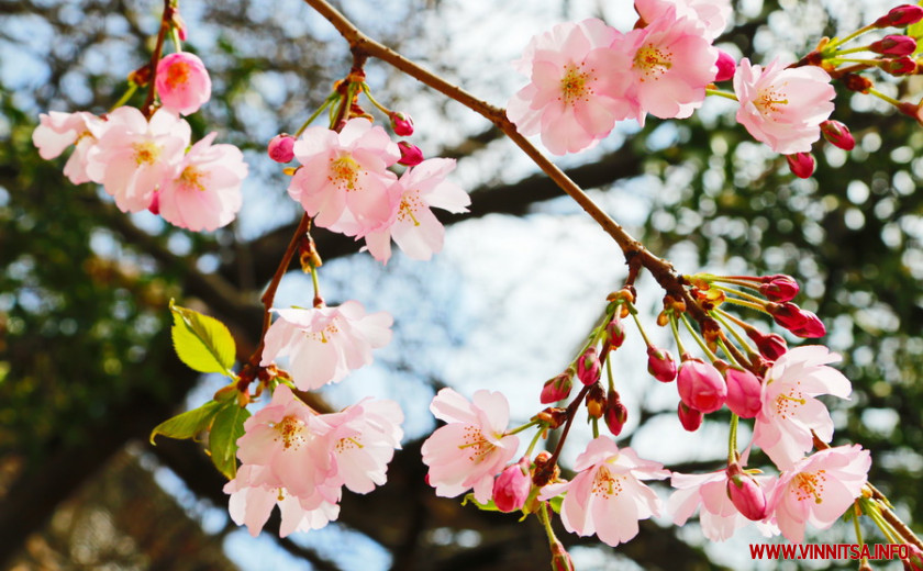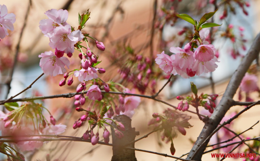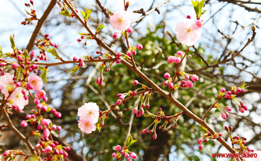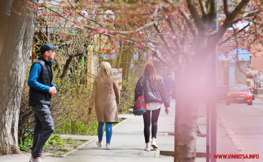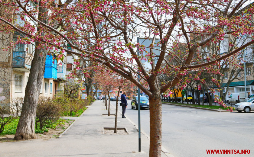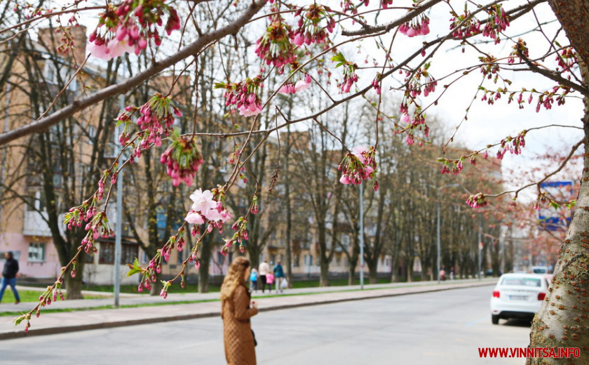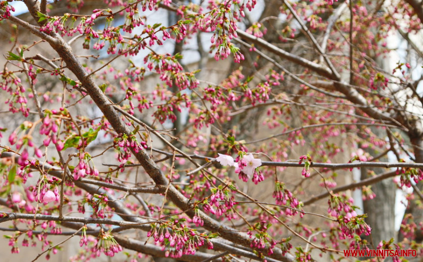Поки ще на деревах більше пуп’янків, ніж квітів. Але це не стає перепоною для вінничан, які збираються під одним-двома деревами і фотографують, як ніжно-рожеві квіти виблискують на сонечку.