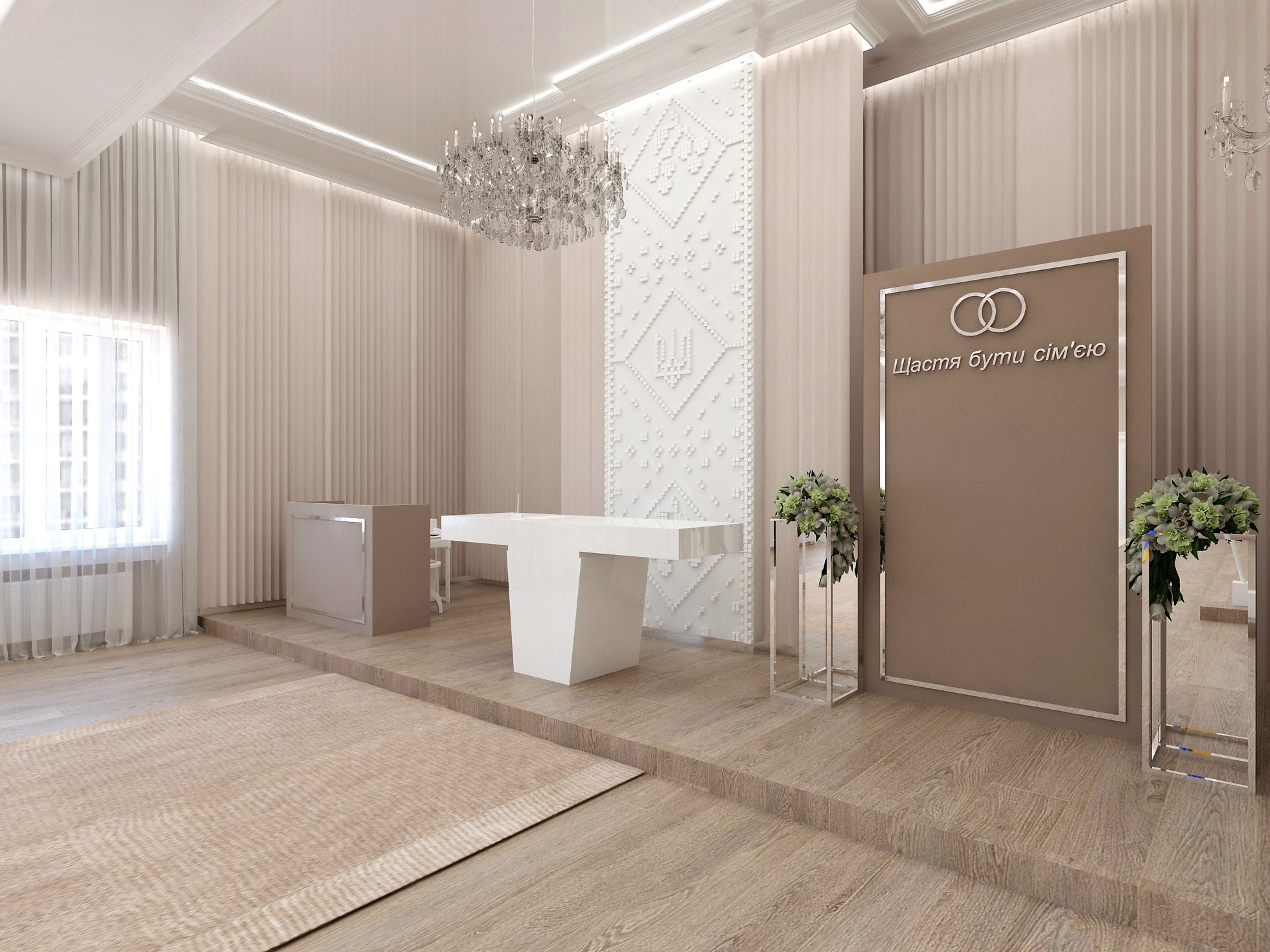 Зал оформили у світлих пастельних відтінках, головний акцент дизайнерів було зроблено на панно з тризубом та калиною. Підлога була повністю замінена, тепер молодята ходитимуть по вініловому покриттю. Стіл, на якому молодята розписуються, реставрували й пофарбували у білий колір. Підсвітка та глянцева натяжна стеля візуально збільшують приміщення і надають йому яскравості та легкості. Також для молодят оформили сучасну фотозону.