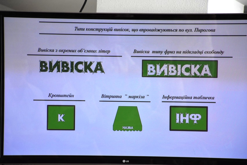 Близько року тому було розроблено комплексну схему розміщення вивісок по вулиці Соборній. Тепер працівники департаменту архітектури і містобудування міської ради розробили комплексну схему розміщення вивісок, у якій вказані детальні вимоги до розміщення рекламних матеріалів на фасадах будівель по вул. Пирогова. Тут є технічні та просторові характеристики: висота літер, розмір інформаційної таблички, кольорова гамма тощо.