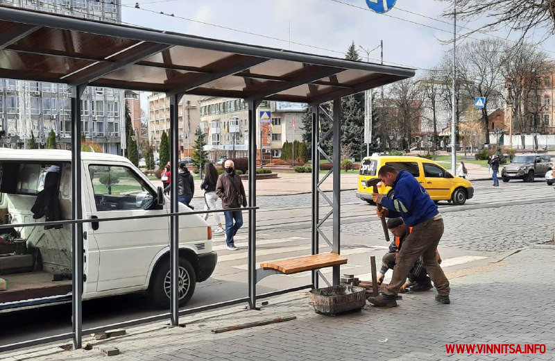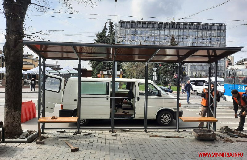 На вулиці Соборній у Вінниці встановлюють нову зупинку громадського транспорту. Скляну конструкцію від рання облаштовують кілька робітників, обіцяють завершити уже сьогодні.