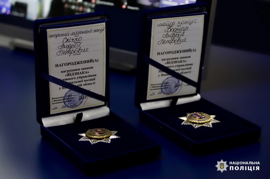 Нагрудним знаком «Відзнака» Головного управління Національної поліції у Вінницькій області нагороджені майор поліції Андрій Боднар та старший лейтенант поліції Андрій Скічко.
