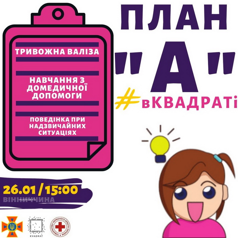 У Вінниці, 26 січня о 15:00 годині в молодіжному центрі «Квадрат» навчатимуть як діяти в надзвичайних ситуаціях. Захід називається «План А». На ньому розкажуть що таке «тривожна валіза», проведуть інструктаж як її збирати та надавати домедичну допомогу.