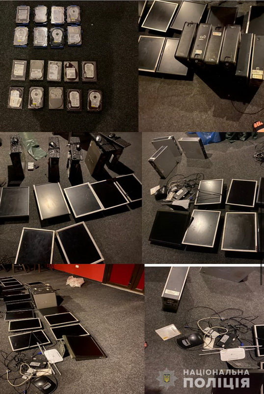 Під час проведення слідчих дій поліцейські вилучили 22 системних блоки, 16 моніторів, клавіатури, жорсткі комп’ютерні диски, відеокамери, флеш-накопичувачі та іншу техніку. Вилучене комп’ютерне обладнання направлено на експертизу.
