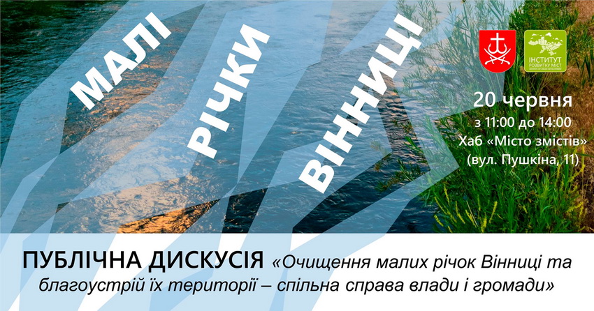 20 червня вінничан запрошують взяти участь у публічній дискусії «Очищення малих річок Вінниці та благоустрій їх території – спільна справа влади і громади». Дискусія пройде у Хабі «Місто змістів» з 11:00 до 14:00 години.
