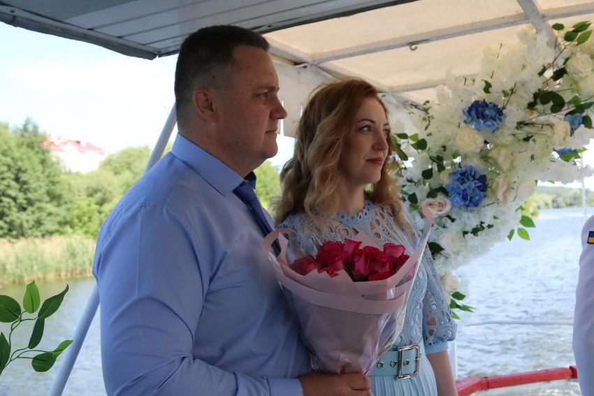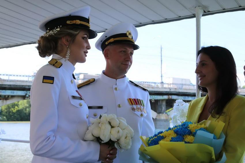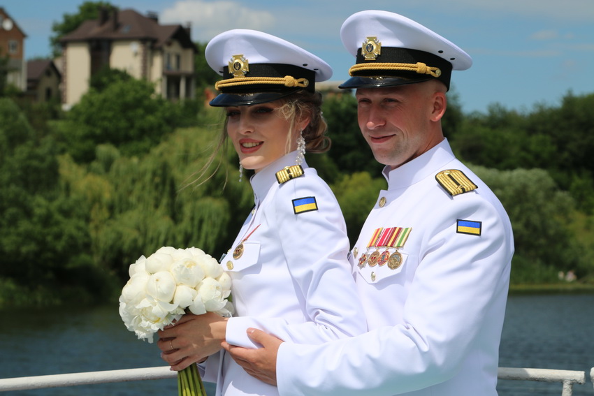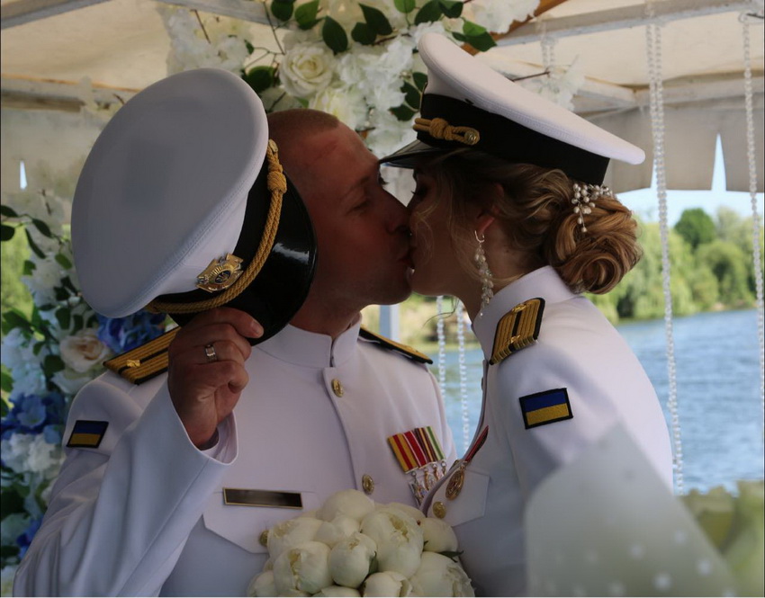 Церемонію одруження у Вінниці провів полковник медичної служби ЗСУ. Розписувались молодята у Вінниці на теплоході. Обоє - у парадній морській формі.