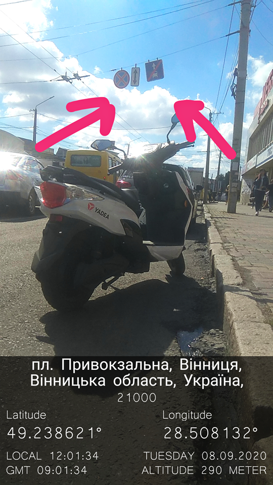 «Транспортний засіб був припаркований також у забороненому місці - на смузі для маршрутних транспортних засобів. Під знаком 3.34 «Зупинку заборонено». Я викликав поліцію, щоб і цей скутер оштрафували», - продовжує В’ячеслав.