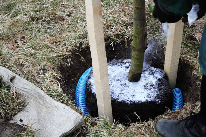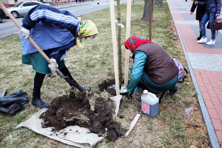 «Технологія посадки дерев надзвичайно проста. Ми викопуємо лунку, з чорноземом, внизу вкладаємо гофротрубу, в яку потім буде йти підкореневий полив, що дуже важливо. Також добавляємо мінеральні добрива, вони допомагають дереву укоренитися та взяти певний склад міндобрив. І також ми добавляємо вологоутримувач. Це така невелика гранула, яка набирає в себе вологу та досить довгий період часу утримує вологість», – розповідає Тетяна Прибиш.