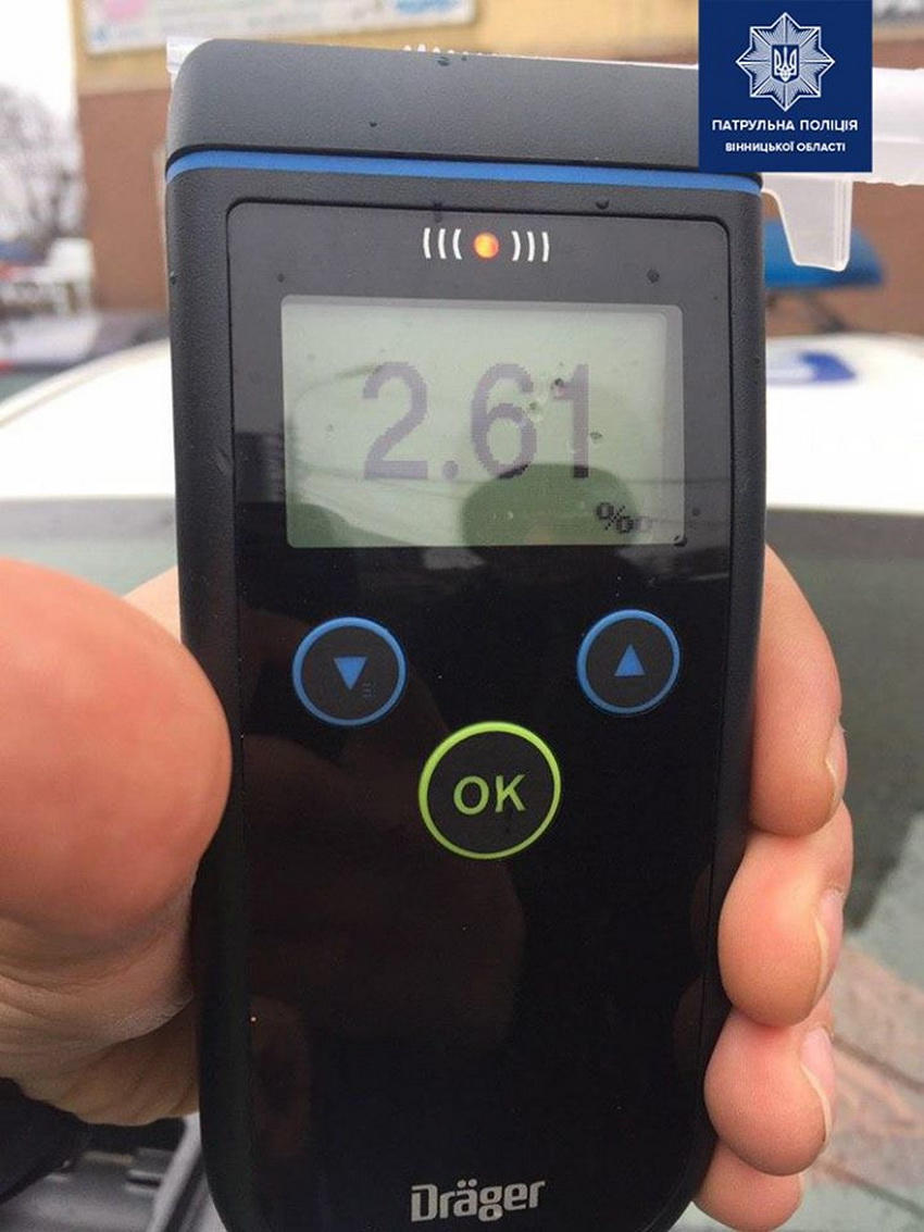 Порушник погодився пройти огляд на місці зупинки в присутності 2-х свідків. Результат огляду — 2,61 проміле, що в 13 разів перевищує допустиму норму.