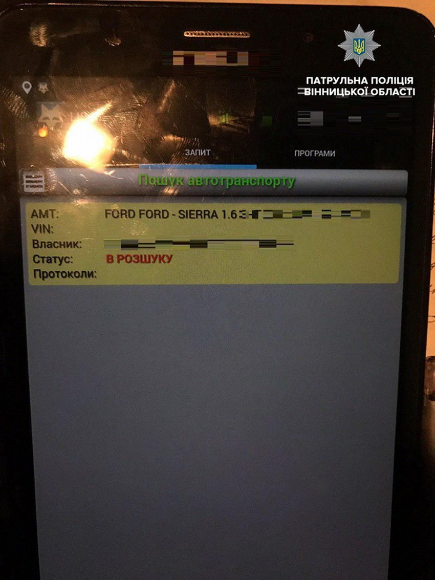23 червня близько1-ї години ночі в селі Вінницькі хутори, патрульні помітили автомобіль «Ford Sierra». Так автомобіль порушив правила дорожнього руху, коли інспектори перевіряли документи, виявилося, що авто крадене і перебуває у розшуку.