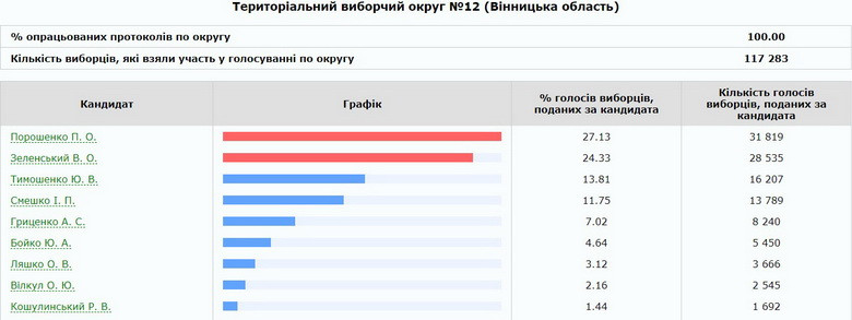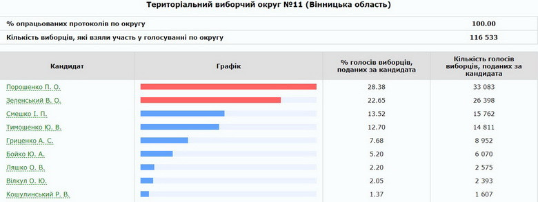 Центральна виборча комісія опрацювала 100% протоколів ще по двох округах області - №11 та №12. Дільниці розташовані та території Вінниці і Вінницького району. В обох округах переможцем голосування з суттєвим відривом від суперника став Петро Порошенко. На другому місці – Зеленський, третя позиція за Тимошенко і Смешком.