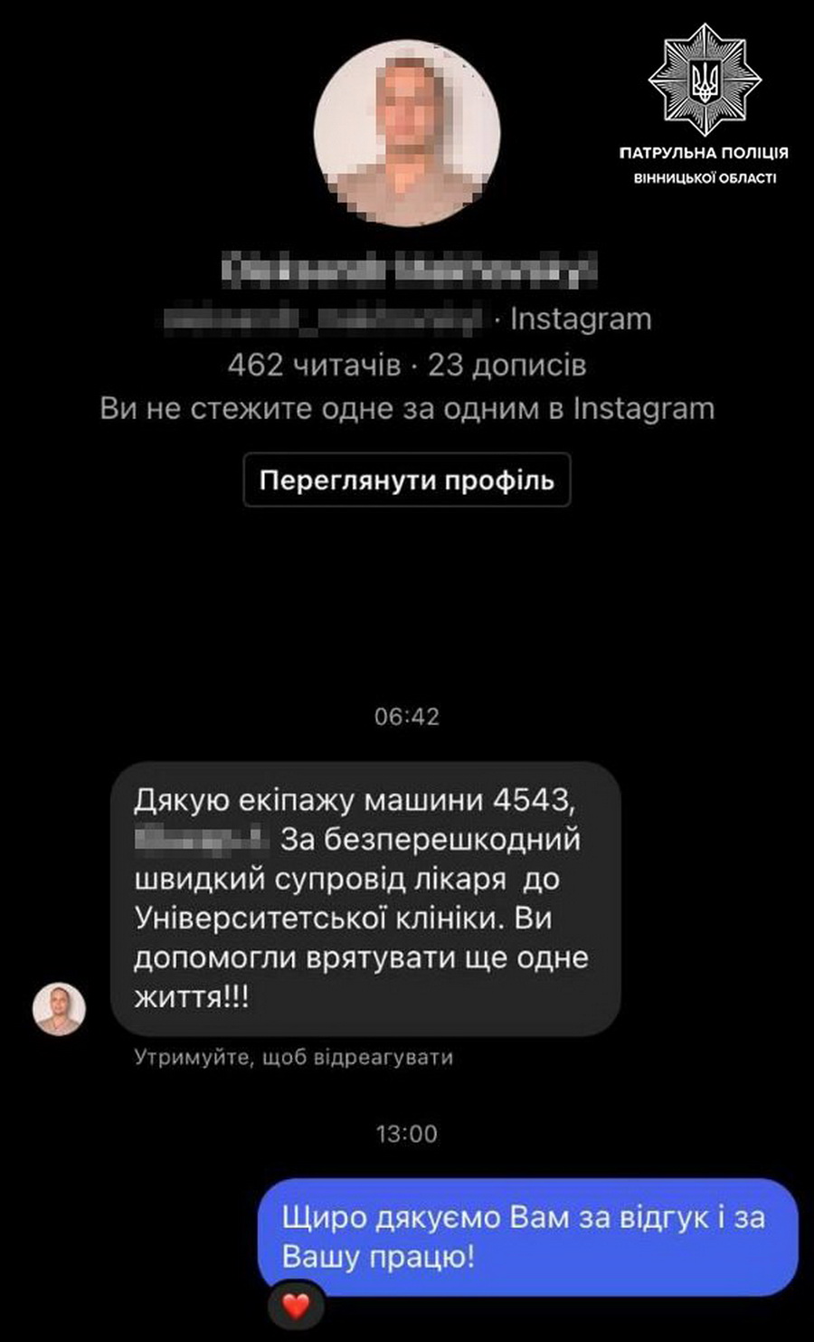 Згодом лікар написав на офіційну сторінку патрульної поліції Вінниччини і висловив подяку екіпажу.