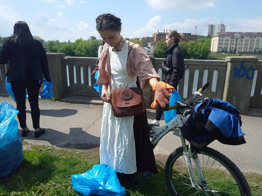 Серед волонтерів своїм образом вразила вінничанка Людмила Поворознюк. Про екологічну акцію вона дізналась з соціальних мереж. Прибирати набережну приїхала на велосипеді у вбранні господині дореволюційного періоду.