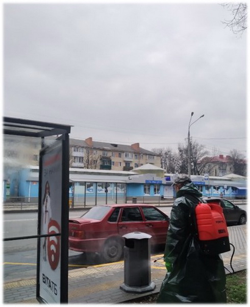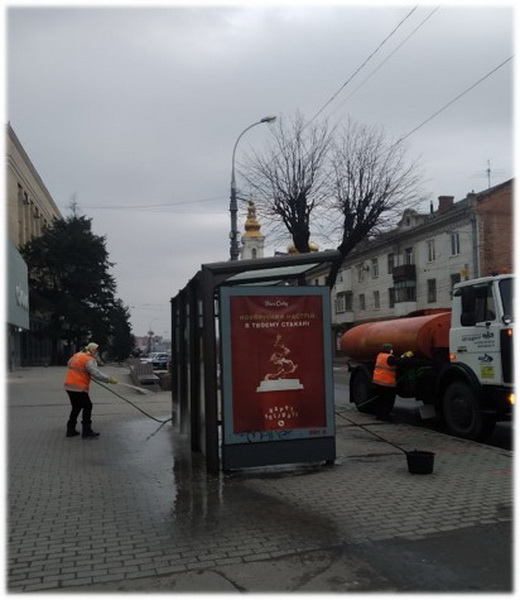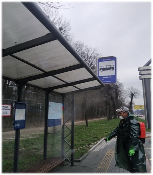 «Починаючи з суботи ми почали обробляти спецзсобами зупинки громадського транспорту. Спочатку працівники миють зупинки водою зі шлагу, потім обробляють дезінфікуючими засобами. Після цього висушують лавку. Наразі вже оброблено близько 70 % зупиночних павільйонів. Робота продовжується», – каже заступник директора департаменту комунального господарства Юрій Семенюк.