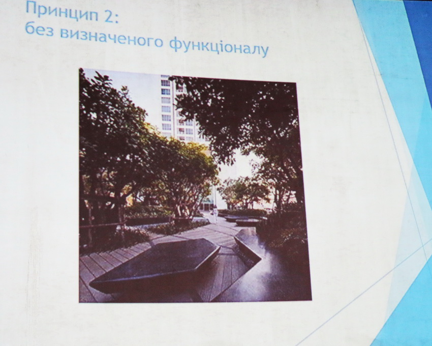 Другий принцип – без визначеного функціоналу. Не означає, що місце буде виключно для сидіння, читання чи вигулу тварин. Принципових навантажень пропонують не нав’язувати.