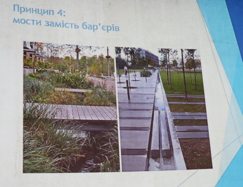 Четвертий принцип – мости замість бар’єрів. Якщо на території буде річка, це не означатиме, що це зможе бути перешкодою переходити територію. Є ідея створити місток у формі надпису «Натан Альтман».