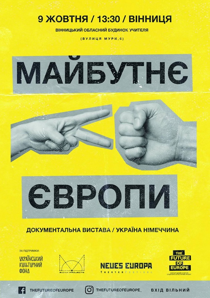 9 жовтня у Вінниці покажуть виставу «Майбутнє Європи». Це документальна вистава про життя 15-ти підлітків, дитинство яких пройшло на Донбасі. Орієнтована на глядацьку аудиторію від 14 до 20 років.