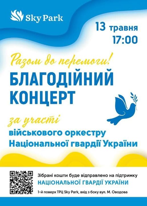 Сьогодні, 13 травня, у Вінниці о 17:00 на першому поверсі торгового центру «Sky Park» виступить військовий оркестр Національної гвардії України з благодійним концертом. Всі бажаючі зможуть долучитися до волонтерських зборів - гроші підуть на забезпечення армії.