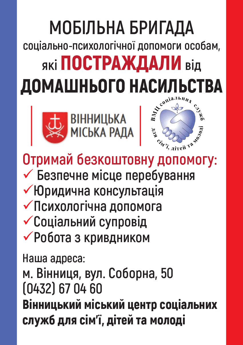 З 1 липня у Вінниці розпочала діяти Мобільна бригада соціально-психологічної допомоги людям, які постраждали від домашнього насильства або насильства за ознакою статі. Вона функціонує при Вінницькому міському центрі соціальних служб для сім’ї, дітей та молоді.