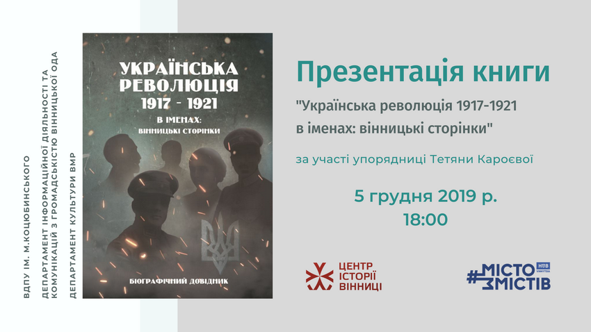 5 грудня у Вінниці презентують біографічний довідник «Українська революція (1917-1921) в іменах: вінницькі сторінки». Захід відбудеться у HUB Місто змістів (Пушкіна, 11), початок о 18 годині.