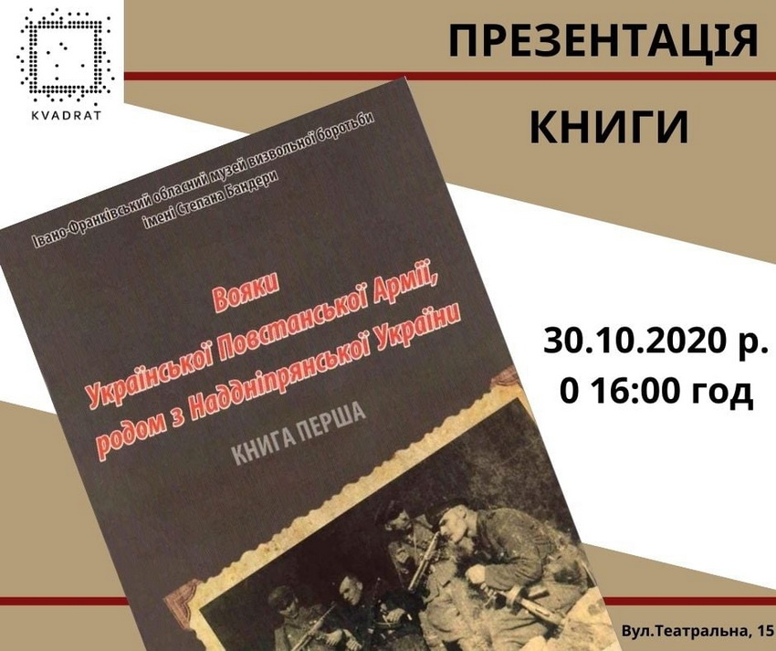 30 жовтня о 16:00 у Вінницькому обласному молодіжному центрі «Квадрат» відбудеться презентація книги «Вояки Української Повстанської Армії, родом з Наддніпрянської України». В ній автори зібрали 776 життєписів вояків Української Повстанської Армії. Мета проекту – довести всеукраїнський характер визвольного руху.