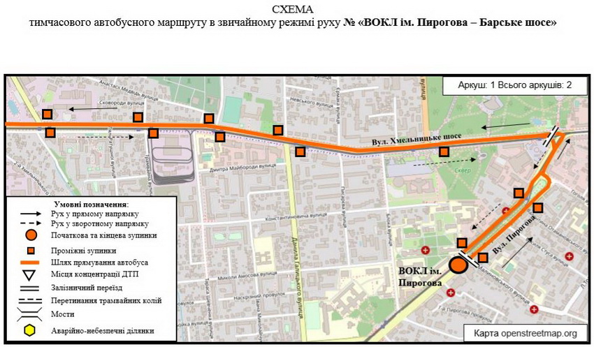 З метою забезпечення перевезення пасажирів по вул. Хмельницьке шосе на час проведення робіт буде запроваджено тимчасовий автобусний маршрут № 4 «Лікарня ім. Пирогова – Барське шосе».