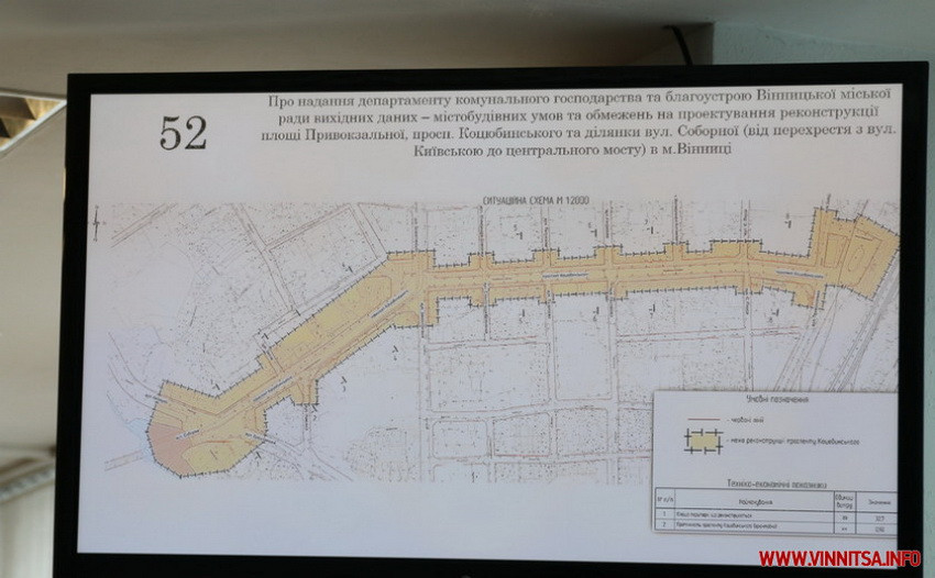 На засіданні рішення про надання департаменту комунального господарства та благоустрою Вінницької міської ради вихідних даних – містобудівних умов та обмежень на проектування реконструкції площі Привокзальної, проспекті Коцюбинського та ділянки вулиці Соборної (від перехрестя з вулицею Київською до центрального мосту) в місті Вінниці прийняли без зауважень.
