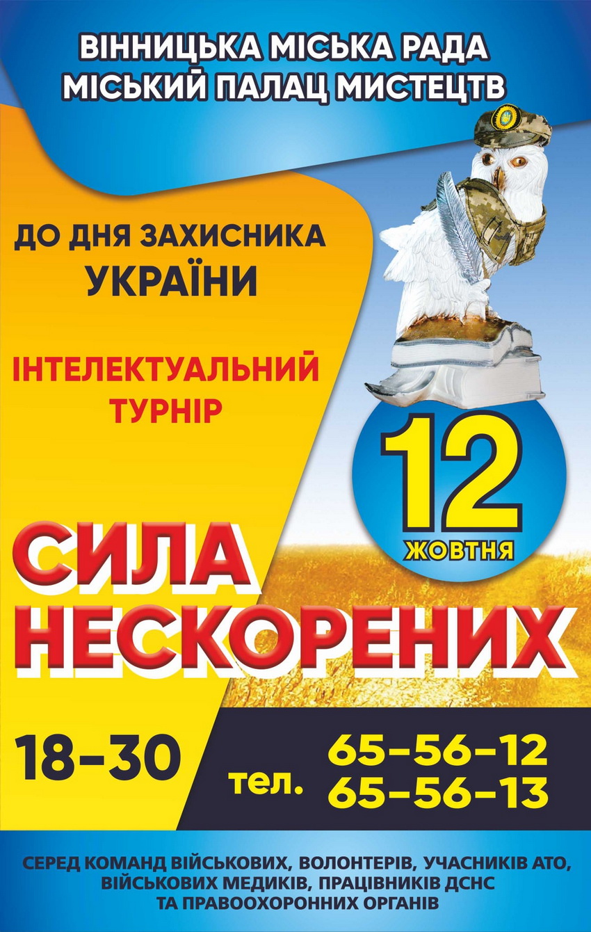 12 жовтня о 18:30, у Вінницькому міському Палаці мистецтв, вул. Стрілецька, 44, заплановано проведення інтелектуального турніру серед військових, силовиків, волонтерів. «Сила нескорених», таку назву має захід, присвячують до Дня захисника України. Принцип гри такий самий, як у «Що? Де? Коли?».