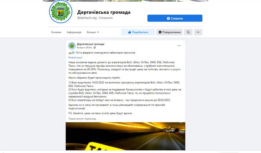 «Наше основне завдання: донести до агрегаторів, що їх поточні тарифи економічно не обґрунтовані та вимагають значного підвищення на 20-30%. Оскільки кожен з вас бачить ціни на пальне, запчастини та послуги з обслуговування авто», - до прикладу, йдеться у зверненні, опублікованому на сторінці Дергачівської громади, що на Харківщині у Facebook.