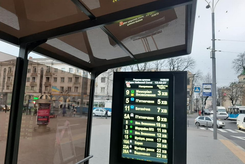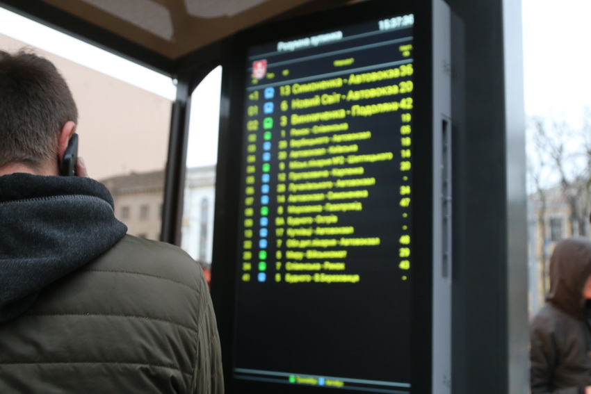 У Вінниці на тролейбусній зупинці тестують електронне табло, на якому відображається графік руху громадського транспорту в онлайн. Підрядник налаштовує розмір шрифту та фонову графіку. Загалом по місту встановлять 50 електронних табло. Спочатку ними облаштують трамвайні зупинки.
