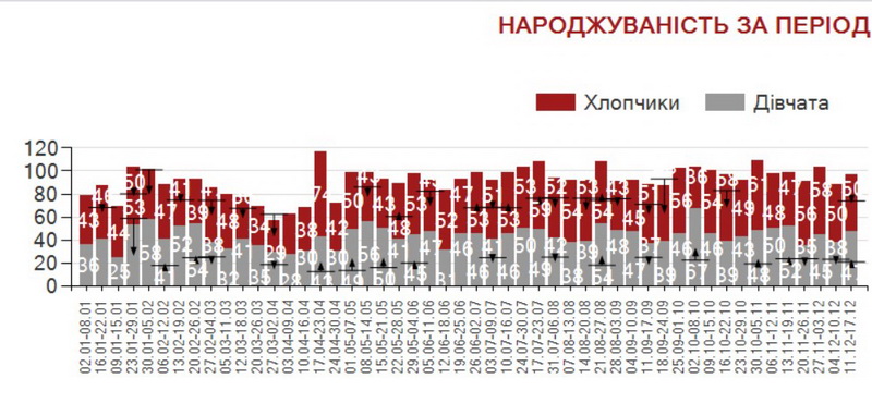 В середньому, кожен тиждень у Вінниці на світ з’являється 100 немовлят. Протягом року, найвищий пік народжуваності за тиждень був з 17 по 23 квітня. Тоді народились 117 малюків – 74 хлопчика і 43 дівчинки.