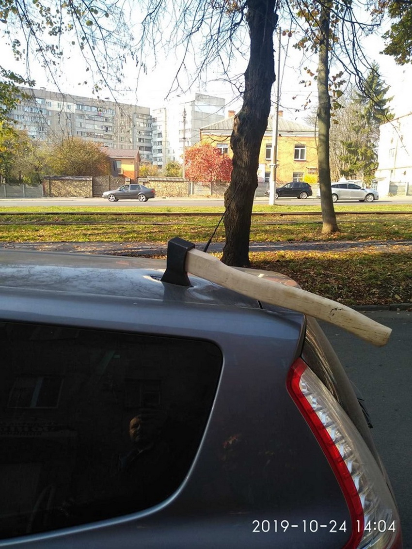 24 жовтня у соцмережі опублікували фото автомобіля «Рено», пошкодженого сокирою. Сокира застрягла у даху транспортного засобу, припаркованого на вулиці Пирогова, між зупинками ім. Заболотного і Дачною.